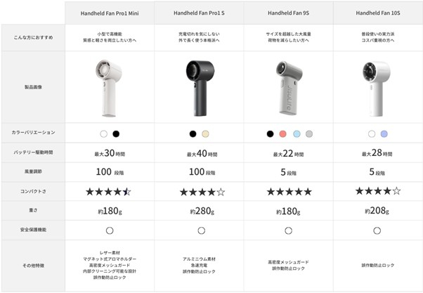 ハンディファン「Handheldシリーズ」比較表