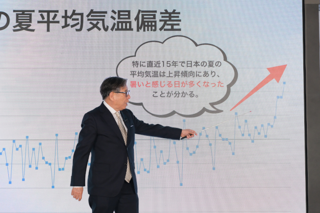 トークショーでは、森田氏が、天気予報の時と同じように数々の雑学を披露しつつ、2010年と25年とでは猛暑日を記録した地点数が倍以上に増えたことをデータで説明。気候変動が進んでいることを指摘した。