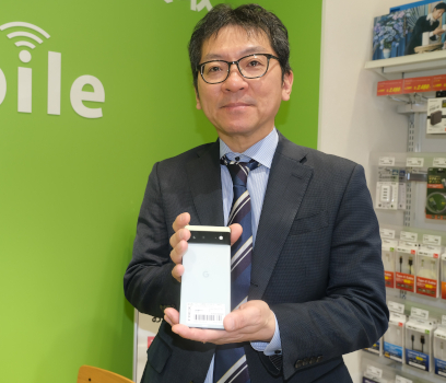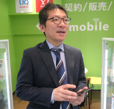 取材に対応してくれたのは、ゲオ ゲオ事業本部モバイル販売推進部のゼネラルマネージャー 藤巻亮さん。中古スマホを選ぶ上でのポイントやメリットについて教えてくれた。