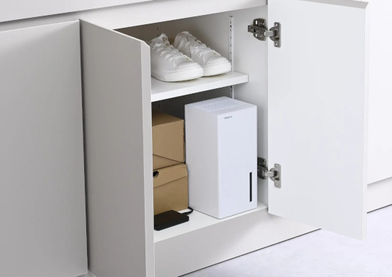 PD36W以上の出力に対応したモバイルバッテリーでの使用が可能。コンセントの位置に左右されず、電源を確保しにくい場所でも柔軟に設置できる。電源の取りにくい収納スペースや玄関周りなど、従来の除湿機で設置が難しかった場所でも使える。