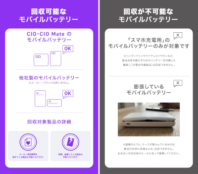 今回のキャンペーンの特徴は、CIOの製品だけでなく、他社製のモバイルバッテリーも対象になる点。メーカー保証期間を過ぎていても、故障や破損があっても回収対象だ。