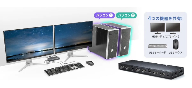 テレワークや副業の普及で、仕事用と個人用など、複数のPCを併用するケースがある。サンワサプライは、2台のPCでデュアルディスプレー環境を共有できる4K対応HDMI切替器「SW-KVM22HUUS」を4月14日に発売した。ディスプレーやキーボード、マウスを都度つなぎ替える手間を省き、作業環境を切り替えながら効率よく使える点が特徴だ。価格は2万1780円。