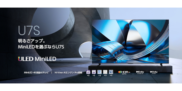 ハイセンスジャパンは4月下旬に、高性能ディスプレーと新開発エンジン「Hi-View AIエンジンPro」で高画質、高音質を実現する、MiniLED×量子ドット搭載4K液晶テレビ「U7S」シリーズとして、100V、85V、75V、65V、55Vの計5サイズを発売する。