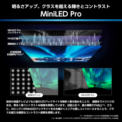 「U7S」シリーズは、従来の液晶テレビよりも小型のLEDバックライトを数多く敷き詰めることによって、細部までメリハリのある、明るく高コントラストな映像を実現するMiniLEDを搭載し、従来機種「65U7S」や「65U7R」と比較して、最大輝度を33%向上した。また、AIエンジンでバックライトを細かく分割してエリアコントロールして、ワンランク上の高輝度と高コントラストを実現している。