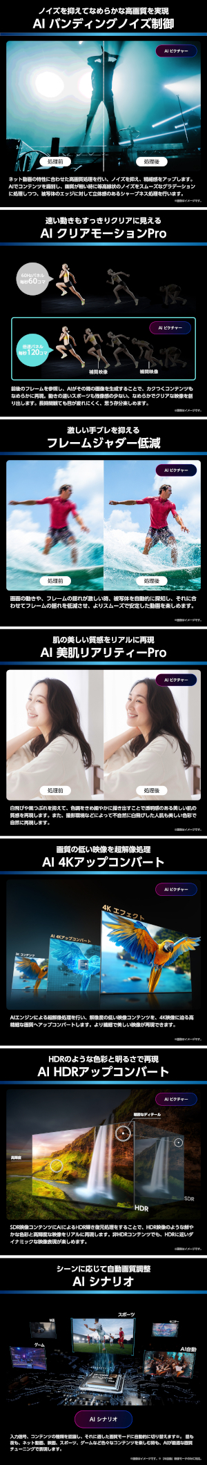 そのほか、TVS社との共同開発によるAIエンジン「Hi-View AIエンジンPro」を搭載し、映像フレームの1枚1枚に対してAIが瞬時に画質処理を行い、画質の粗いコンテンツでも解像度の高い、色鮮やかで高コントラストのなめらかな映像を実現する「AIピクチャー」、ネット動画の特性に合わせた高画質処理を行うことによって、ノイズを抑えて精細感をアップする「AIバンディングノイズ制御」、前後のフレームを参照してAIがその間の画像を生成し、カクつくコンテンツもなめらかに再現する「AIクリアモーションPro」、画面の動きや激しいフレームの揺れを自動で検知して、それに合わせてフレームの揺れを低減させて、よりスムーズで安定した動画を楽しめる「フレームジャダー低減」、白飛びや黒つぶれを抑えて色調をきめ細やかに描き出し、透明感のある美しい肌の質感を再現する「AI美肌リアリティーPro」、AIエンジンによる超解像処理で、解像度の低い映像コンテンツを4K映像に迫る高精細な画質へアップコンバートする「AI 4Kアップコンバート」、SDR映像コンテンツにAIによるHDR輝き復元処理をすることで、HDR映像のような鮮やかな色彩と高輝度をリアルに再現する「AI HDRアップコンバート」、入力信号やコンテンツの種類を認識して、それぞれに適した画質モードへ自動的に切り替える「AIシナリオ」といった、多彩なAI機能を備えている。