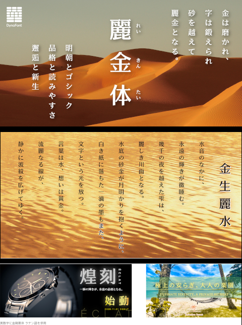 「麗金体」は、明朝体の気品とゴシック体の力強さを融合させた、独自の造形で重厚感と勢いを表現した書体。視認性とアイキャッチ効果に優れており、本文用として他書体と調和しつつ、広告やテレビのテロップでは圧倒的な存在感を放つ。