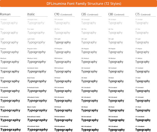 全12ウェイト、計72書体の展開で、「ダイナフォント」としては初となる「イタリック体」や、4段階の幅を持つ「コンデンス書体」も用意しているので、デザインの可能性を広げられる。