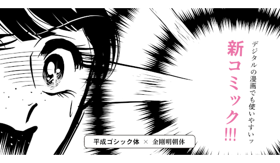 「新コミック」は、おもに漫画のフキダシに使用される「アンチック体(ゴシック体の漢字+明朝体のかな)」の新書体。漢字部分にはバランス感覚に優れる「平成ゴシック体」、仮名部分には新時代の明朝体「金剛明朝体」を採用している。横画を太くして角に丸みを持たせた仮名のデザインにすることで、紙媒体だけでなく電子書籍といった環境でも読みやすい。