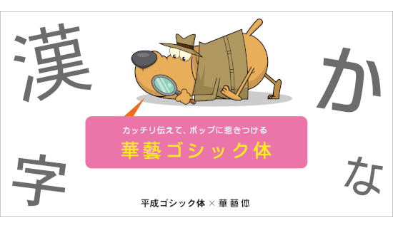 「華藝ゴシック体」は、バランス感覚に優れる「平成ゴシック体」の漢字に、キャッチーなPOP系書体「華藝体」の仮名を混植したハイブリッド書体。漢字の理知的な骨格と仮名の親しみやすい曲線によって、文章に独自のコントラストを描き出すため、組版全体に美しいリズムがもたらされる。