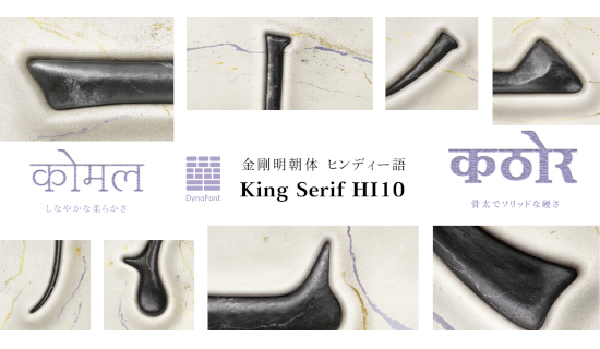 「DF King Serif HI10」は、「金剛明朝体」の人間味あふれる気品をヒンディー語で再現した書体。Unicode準拠の242文字に対応し、8ウエイトを用意している。日本語版フォントとの組み合わせ時でも統一感のあるレイアウトを可能にする。