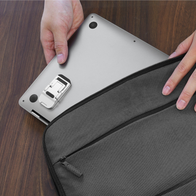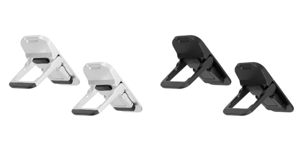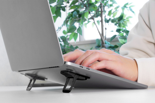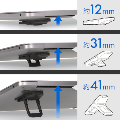 新製品は、ノートPCの背面に貼り付けるタイプのPCスタンド。小型ながら、3段階の高さ調整機能を持ち、PC本体の熱を逃がす放熱効果も期待できる。サイズは、縦約61.5×横30×高さ10.5mmで、重さは1個あたり約43.5g。