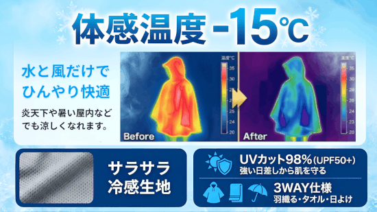「涼マント」は、水で濡らして絞って振るだけで体感温度が15℃下がる冷感ポンチョと、応援タオルをセットにした商品。UVカット率は98%(UPF50+)で、真夏の球場観戦における暑さと紫外線の両方から身体を守ってくれる。