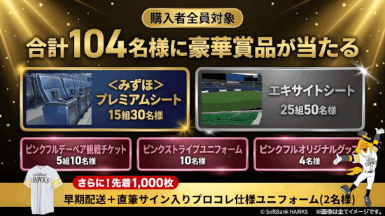 あわせて、LINE公式アカウントに友だち追加してエントリーした人の中から、毎月抽選で50組100名にホークス観戦ペアチケットが当たるキャンペーンも行われる。