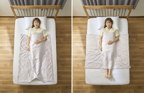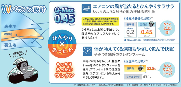 エアコンをつけっぱなしで寝る人のためのブランケットで、表生地と裏生地には接触冷感生地、中材には保温性の高いウレタンフォームを採用したWバランス設計の3層構造によって、寝入りはひんやり心地よく、夜中はじんわりあたたかくなって、エアコンをつけっぱなしでも寝冷えを防げる。