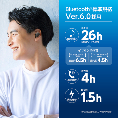 連続使用時間はイヤホン単体で最大6.5時間、ケース併用で最大26時間。10分の充電で約1時間再生できる急速充電にも対応している。