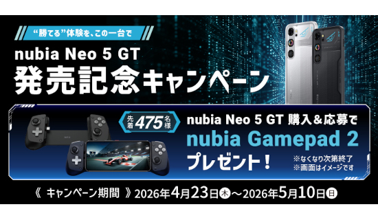 なお、「nubia Neo 5 GT」の発売を記念し、購入者にスマホ用ゲームパッド「nubia Gamepad 2」をプレゼントするキャンペーンも実施中。先着475名とのことで、購入を考えている人は要チェックだ。