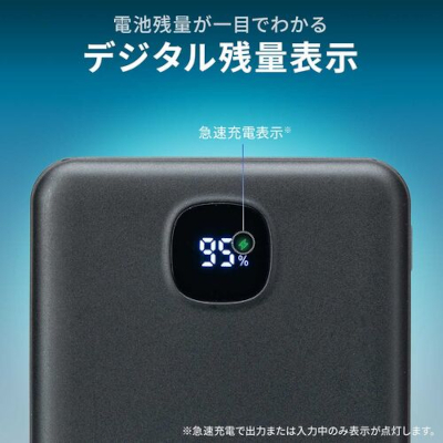 出力は最大20W出力で、機器に応じた最適な電圧・電流で効率的に充電可能だ。インジケーターは1%刻みのデジタル表示で残量がわかりやすい。