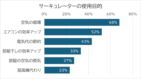 同社が実施したユーザー調査によると、サーキュレーターの使用目的で最も多かったのは『空気の循環』で、回答者の7割近くが挙げた。以下、『エアコンの効率アップ』『電気代の節約』と続いている。