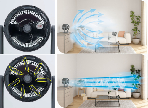 このような市場やユーザーの利用実態を背景として同社が開発したのが、1台で強く直進的な風とやわらかく広がる風を送り、“サーキュレーターと扇風機の風を操る”というコンセプトの新製品2WAYサーキュレーターRC-AA30(以下、AA30)である。