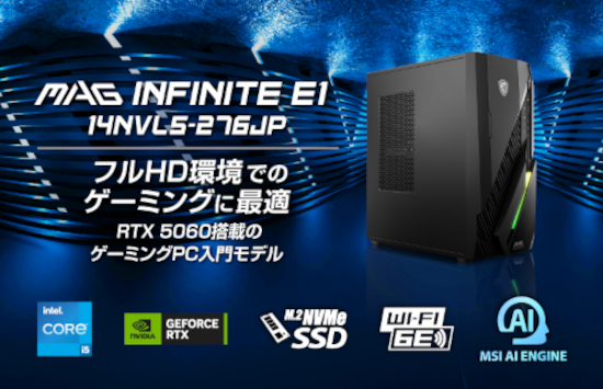 エムエスアイコンピュータージャパンは4月30日、インテル Core i5・NVIDIA GeForce RTX 5060搭載のコストパフォーマンス重視構成を採用した、エントリー向けゲーミングデスクトップPC「MAG Infinite E1 14NVL5-276JP」をMSI公式ストアで発売する。価格は20万8000円前後。