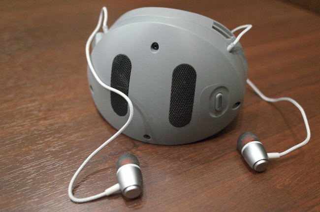マスクの中にある本体の消音ユニット。左右からイヤホンが出ている。
