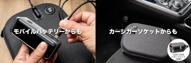 給電は、ACアダプター・USB-C(18W以上対応)・カーシガーソケット(別売)から行う。本体にはバッテリーを搭載しておらず、長期保管も可能。防災グッズとしても重宝しそうだ。