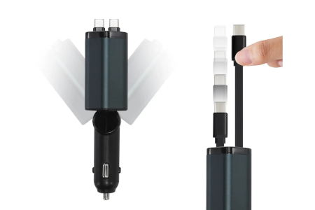 車内の充電コード問題を一発解決! ごちゃつくインパネ周りで悩まない「4in1巻き取り式カーチャージャー」