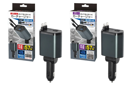 スマートフォンやタブレット端末を車内で充電しようとすると、ケーブルが何本も垂れ下がり、インストルメントパネル(インパネ)周りが雑然としてしまう──。そんな悩みに応える製品が登場した。総合雑貨メーカーのハックは、車内充電をスマートにする新アイテム「4in1巻き取り式カーチャージャー」と「3in1マルチケーブル」を5月から発売する。
