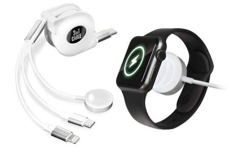 3in1マルチケーブルは、Type-C・iOS端子・Apple Watch充電の3役を1本でこなす巻き取り式ケーブル。複数のケーブルを持ち歩く必要がなく、外出先や車内、オフィスでの充電を1本で完結できる。