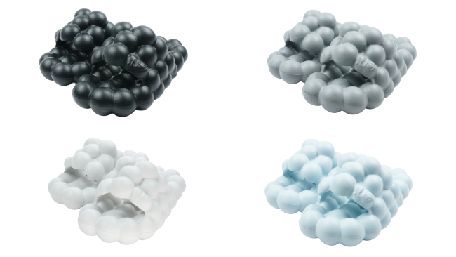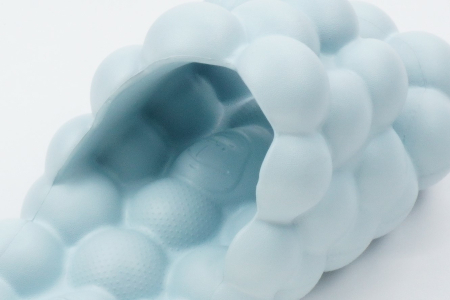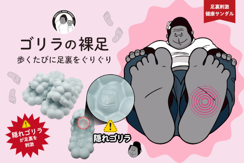 「ゴリラの裸足」は、インソール部分だけでなくアウトソールやアッパー部分にも、球体が集合したような凹凸のあるデザインを採用した、これまでにない立体感のあるサンダル。インソールの中央部分には、他の凹凸と比較して約5mm高い、立体的なゴリラの顔を配置しており、歩くたびに足裏をしっかり刺激するため、履くだけで心地よい体験ができる。