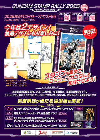 TOKYOガンダムプロジェクト 2026実行委員会は5月2日~7月12日の期間、「ガンダムスタンプラリー2026(GUNDAM STAMP RALLY 2026)」を臨海副都心(おもに台場・青海)エリアにて展開する。第1弾として、6月7日までの期間は、凛々しいユニコーンモードの立像をモチーフにデザインしたスタンプとなっている。