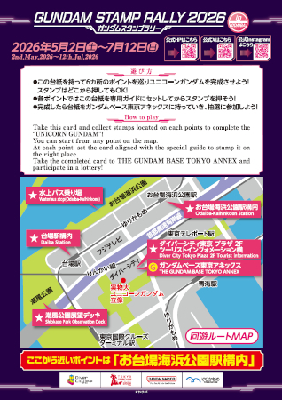 「ガンダムスタンプラリー2026」では、臨海副都心内の潮風公園展望デッキ、水上バス乗り場、お台場海浜公園駅といったスポット6カ所を廻って、各所で台紙にスタンプを重ね捺しすることで、実物大ユニコーンガンダム立像ヴィジュアルを完成させていく。所要時間は約1時間で、どのスポットからでも始められ、各スポットには英語での説明も用意しているため、海外から訪れた人でも参加できる。