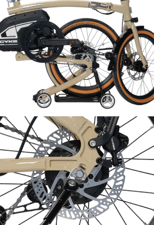 さらに、衝撃吸収性が高く長期間の使用に強いほか、折りたたみ構造でも優れた耐久性を有するクロモリ(クロムモリブデン鋼)製のフレームを採用するとともに、雨天時でも安定した制動力を発揮する油圧ディスクブレーキ(TEKTRO)を搭載している。