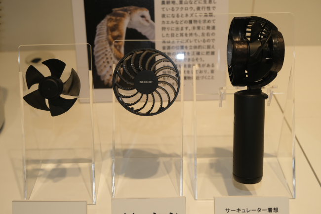 フクロウの翼を参考にした「ネイチャーテクノロジー」も、既存製品のサーキュレーターから応用した技術だ。フクロウは、羽ばたく際も、音がせず、簡単に獲物に近づくことができる。これに着想を得て、グリルに凹凸構造を取り入れ、ファンの断面に膨らみを持たせることで、運転音の抑制に成功している。