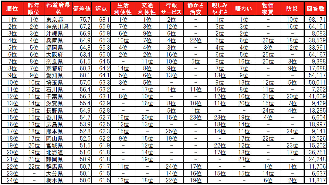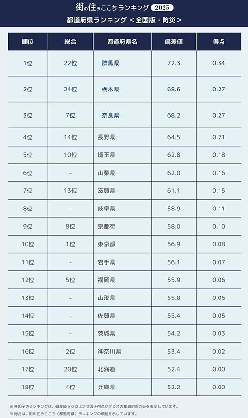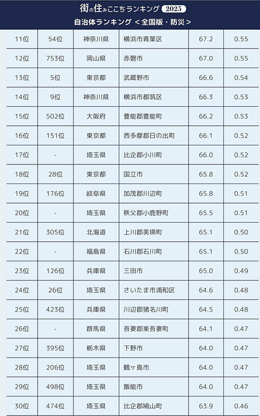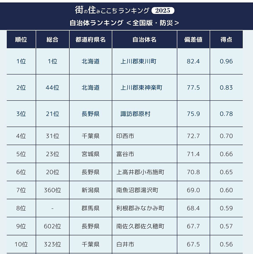 居住者が答える「防災」に強い街 都道府県トップ5&市町村トップ30 2025/08/30 19:00 Tweet 1/4 街の住みここちランキング2025 都道府県ランキング トップ24 記事詳細ページ 注目の記事 【2025年版】防災はここまで進化! 最新デジタルグッズで備える 西武鉄道とJR東日本、初の直通運転!? 両社の「ポイント」からルートを考えてみる 「SUUMO住みたい街ランキング2025 首都圏版」発表、「船橋」「立川」「柏」「藤沢」などの郊外駅が過去最高位に! 首都圏エリア359位まで公開! 2024「いい部屋ネット 子育て世帯の街の住みここちランキング」駅ランキング ポータブル電源は「非常用」から「日常インフラ」へ、「EcoFlow DELTA」シリーズで暮らしが変わる 外部リンク 「いい部屋ネット 街の住みここち&住みたい街ランキング」=https://www.eheya.net/sumicoco/