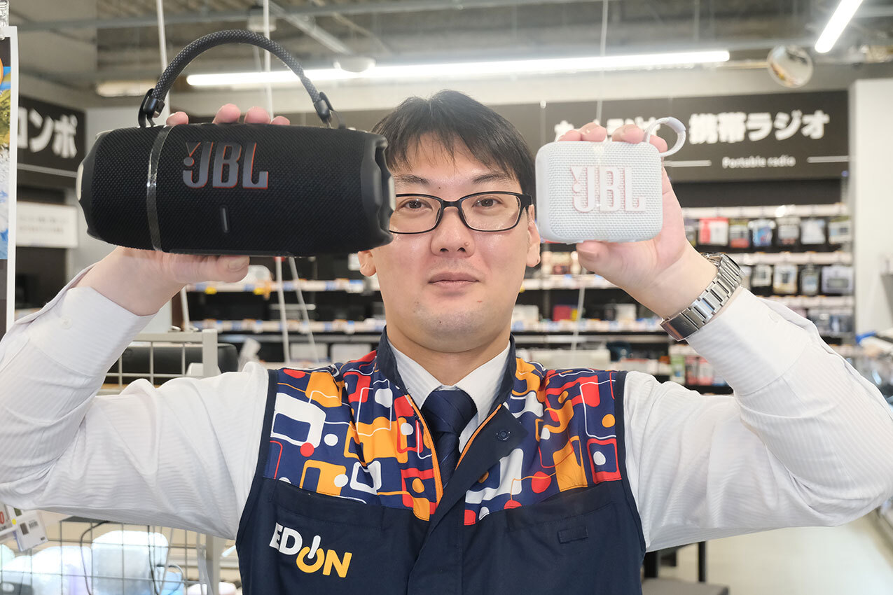 売れ筋ランキング常連 JBLのワイヤレススピーカーの魅力とは? 家電量販店で聞いてみた 2025/11/26 17:00 Tweet 1/11 ギターを弾くというエディオン歴16年の小島さん もちろんオーディオ関係にも詳しい 記事詳細ページ 注目の記事 「Soundcore Select 4 Go」浮上! ワイヤレススピーカー人気ランキングTOP10 2025/11/22 どこでもライブ感! ワイヤレススピーカー人気ランキングTOP10 2025/11/15 MarshallのBluetoothスピーカー「Acton III」に新色「Burgundy」登場 ペアリングするだけで本格サウンド楽しめるシンプル仕様 肩掛けできるポータブル電源が登場、「Jackery 300D」がアウトドアと防災を変える 災害級の熊対策に!「大音量×光×狼」の威圧感で驚かせる「猛獣ブロックW-1」 外部リンク エディオン横浜西口本店=https://www.edion.com/ito/contents/special/lp/231214_yokohamanishiguchi/ 「Flip 7」 エディオン公式通販=https://www.edion.com/detail.html?p_cd=00081291090 「GO4」 エディオン公式通販=https://www.edion.com/detail.html?p_cd=00078280366 「CHARGE 6」 エディオン公式通販=https://www.edion.com/detail.html?p_cd=00081291076
