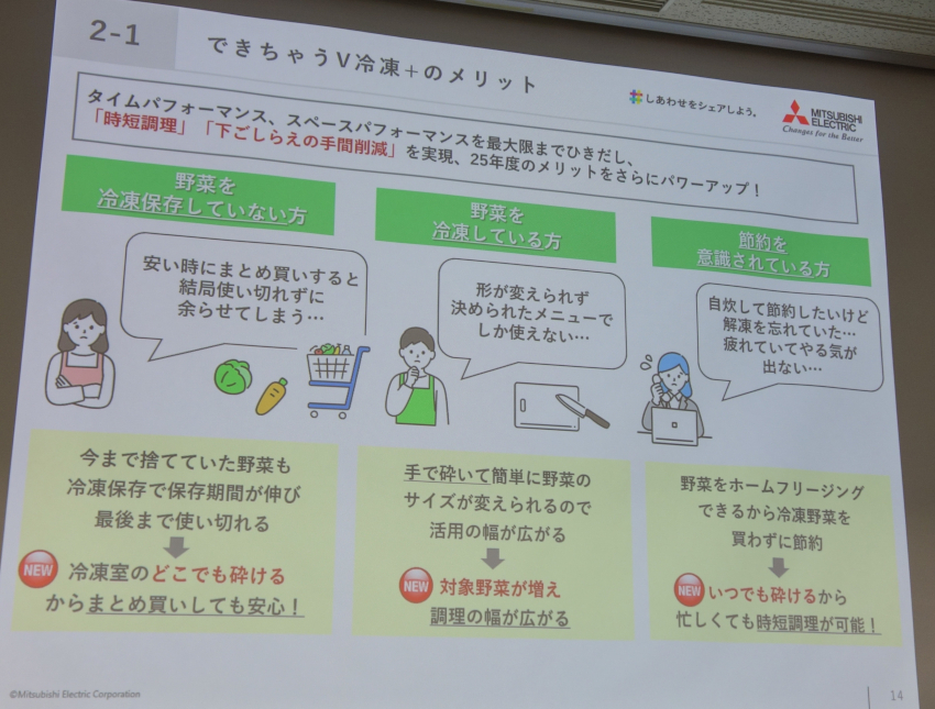 三菱の冷蔵庫、新機能「できちゃうV冷凍+」は時短調理や節約、節電、食品ロス削減などメリットがいっぱい 2026/01/15 16:00 Tweet 1/11 Nadia Artistで料理家の西岡麻央さんが「できちゃうV冷凍+」で餃子をつくる実演 記事詳細ページ 注目の記事 物価高騰で「外食や中食が減り自炊が増えた」は56%、クリスマスは「自宅で食べる派」が91%に! エディオン、魅力的な家電を購入したけど気に入らなかったら「全額返金保証」 AQUA、初めてのセカンド冷凍庫にぴったりな「スリムフリーザー」 冷凍庫の霜取りの方法を解説 詳しい手順から注意点まで 冷蔵庫のおすすめ製品と選び方を解説 容量や機能をしっかり確認して選ぼう 外部リンク 三菱電機=https://www.mitsubishielectric.co.jp/ja/
