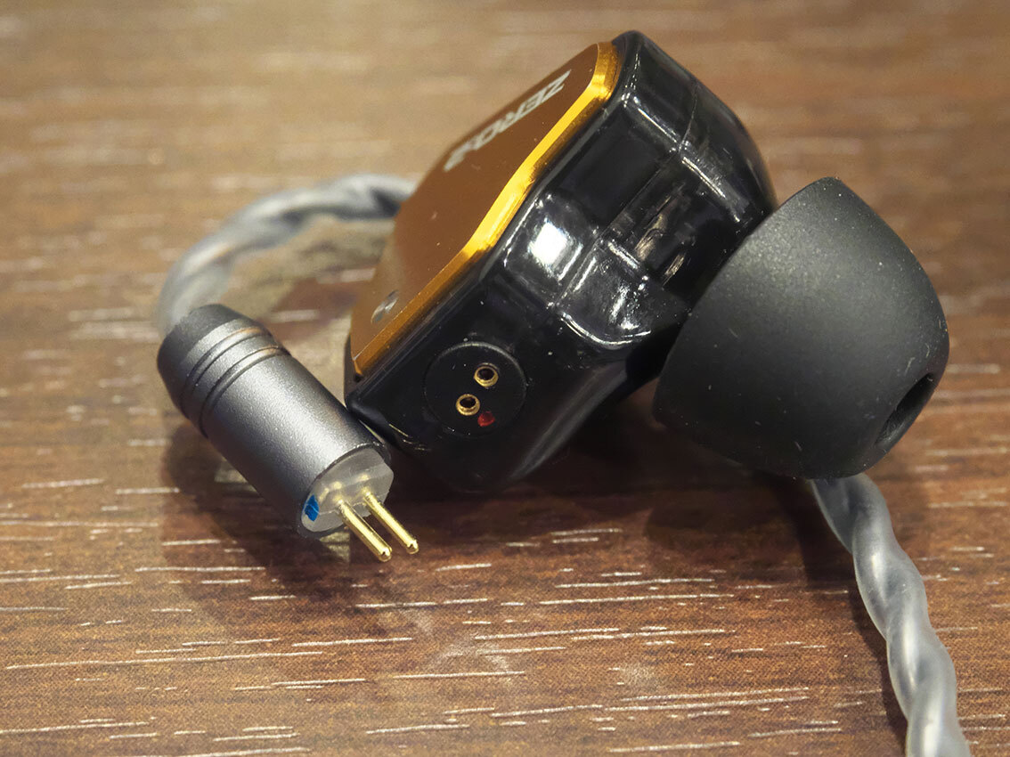 マイク付きのものにリケーブル。左がオリジナルのケーブル。イヤホンがついている右が、リケーブルしたもの。中央付近に灰色の小さな箱がケーブル途中についているが、これがマイクだ。イヤホンはコスパがいいと評判のLINSOULの「7HZ×Crinacle Zero 2」。接続規格は2pin・0.78mmだ