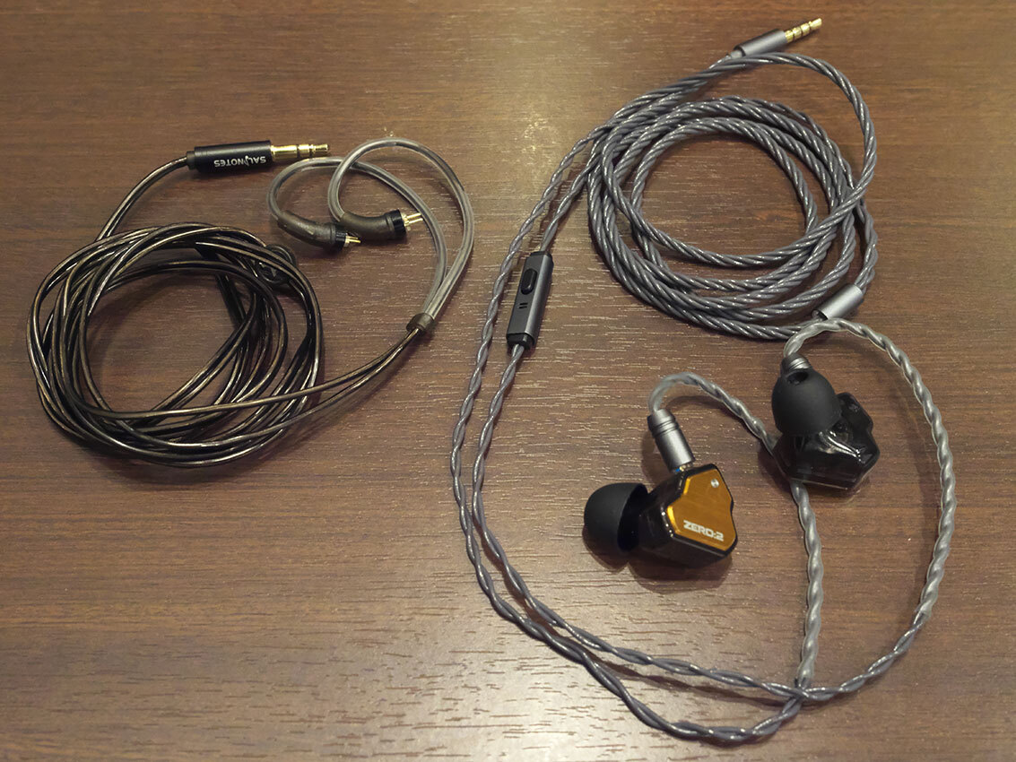 音楽プレーヤー用に刺さるプラグの種類も増えてきた。左からスマートフォン(Google Pixel 6a)用のUSB-C、オーディオプレーヤー(HIDIZS AP80 PRO)の3.5mmアンバランス接続、2.5mmバランス接続、同じくオーディオプレーヤー(HIDIZS AP80 PRO MAX)の4.4mmバランス接続。これらのプラグを取り換えられるケーブルは重宝だ。イヤホンは、これもコスパが高いと評判のFanmusic「TRUTHEAR x Crinacle ZERO:RED」。接続規格はこちらも2pin・0.78mm