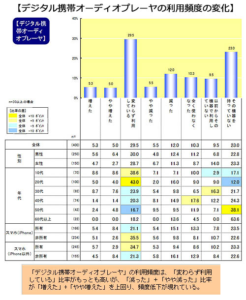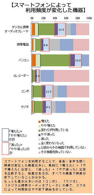 近年、音楽視聴機能を持つデバイスは携帯オーディオなどの音楽視聴専用デバイスだけでなく、PCや携帯電話、スマートフォンなど多様化しつつあります。特に普及が拡大しているスマートフォンは、本体に音楽を保存して視聴できるほか、インターネットの動画サイトなどの視聴も可能なことから、音楽視聴の専用デバイスとの競合アイテムとして考えられています。