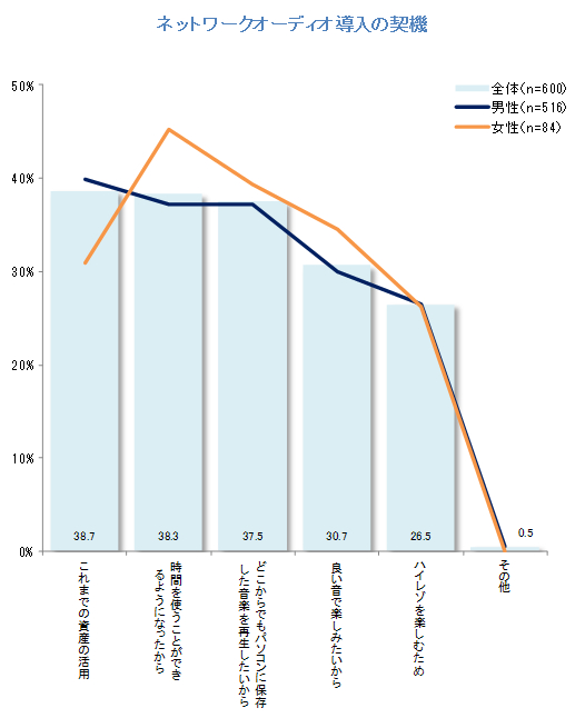 | 調査対象 | 20代~50代 600件 BCNが指定するネットワークオーディオ(61機種)を無線LAN(Wi-Fi)またはLANを経由して利用しているユーザー |