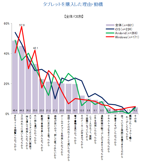 市場の拡大が続き、個人用情報デバイスとして存在感を増しつつあるのがタブレット端末です。搭載OSをみると、「Windows」対応版も徐々に普及がすすみ、「iOS」と「Android」を含めた三つ巴の様相を呈しはじめました。これらOSの違いによるタブレットの位置づけや使い分けがすすむ可能性があります。また、タブレットの普及でパソコンやスマートフォンの利用状況が変化していく点も指摘されています。こうした利用実態の変化を分析するのが、今回の調査目的となっています。