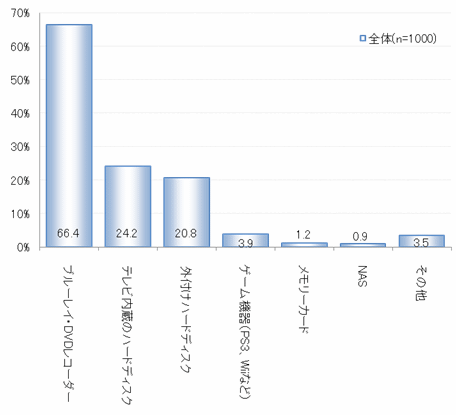 テレビ番組を録画する機器は、「ブルーレイ・DVDレコーダー」(BD・DVDレコーダー)が66.4%と最も高い利用率となった。続いて、テレビと一体となることで省スペースにも効果的な「テレビ内蔵ハードディスク(24.2%)」とレコーダーに比べて価格を抑えることができる「外付けハードディスク(20.8%)」がそれぞれ2割を超えている。(図1)