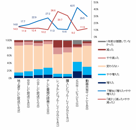 これに関連して、各映像項目の視聴頻度について聞いたところ、「レンタルしたブルーレイ・DVD」と「購入したブルーレイ・DVD」の項目が、1年前より視聴頻度が減少したという結果になった。(図2)