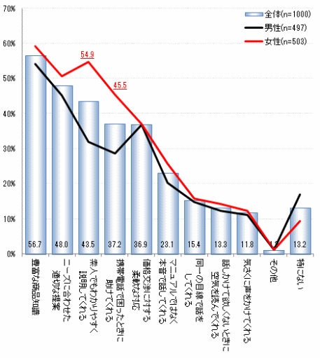 また、キャリアショップを訪れた際、店員に求めることは「豊富な商品知識」(56.7%)が最も高かった。男女別に比較してみると、「素人でもわかりやすく説明してくれる」と「携帯電話で困ったときに助けてくれる」の項目で、女性の比率が男性を大きく上回っている(図2)