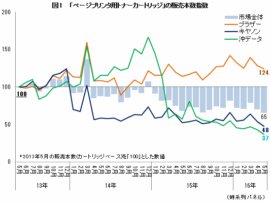 トナーカートリッジはそれぞれトナー容量の違いで印刷枚数が異なるうえ、一本単位または複数本をまとめたセット販売もあるため、ここでは販売数量をカートリッジベースに置き換えて数値を算出している。市場全体と販売本数シェアが高い上位3社の動きを、2013年5月のそれぞれの販売実績を「100」とした指数でみていくと、まず、市場全体では消費増税前の駆け込み特需となった14年3月に数値が上昇したが、その後は低調に推移。今年5月は「65」と、3年前に比べて3割以上も落ち込んだことを示している。一方、3社の指数では増税前特需までは似通っているが、ここ1年ほどは二極化が現われている。高水準をキープするブラザーとは対照的にキヤノンと沖データは数値を大きく下げており、この5月はブラザーの「124」に対して、キヤノン「48」、沖データ「37」となった。3社のなかではブラザーだけが販売本数を大きく伸ばしたことなる(図1)。