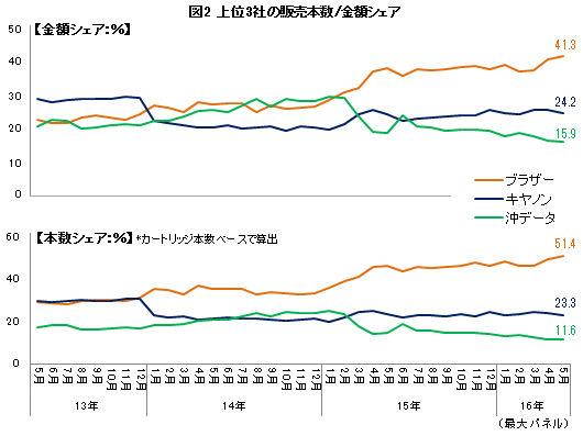 ブラザーの躍進は、過去3年のトナーカートリッジの販売本数/金額シェアにも現れている。本数シェアでは時間の経過とともにブラザーの数値は上昇、直近の5月は51.4%と初めて5割を超えた。一方、金額シェアでも似通った動きとなっており、5月は41.3%と過去最大を記録している(図2)。