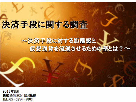 BCNでは、2016年8月に<第4回 セキュリティソフト利用者調査><第2回 家電量販店、販売店員向け調査><決済手段(仮想通貨)に関する調査>、以上3つの調査を実施いたします。決済手段(仮想通貨)に関する調査では、ビットコイン等の影響で認知が広まった仮想通貨のニーズを探るため、商品によってどのような決済手段を消費者は行っているのかを把握する調査を行います。