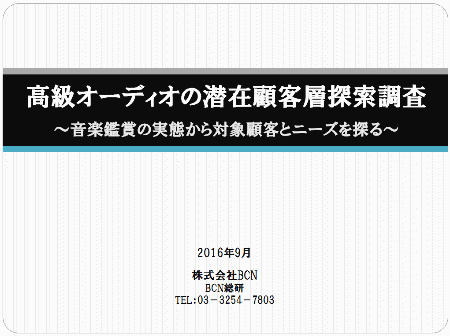 BCNでは、2016年9月に<高級オーディオ調査><内蔵SSD利用実態調査><東アジアメーカーに関する調査>、以上3つの調査を実施いたします。 高級オーディオ調査では、ヘッドホンやスピーカー、アンプなどの様々な高級オーディオ機器が発売されているなか、今後新たに高価格帯の商品を購入しうる、対象顧客は誰なのかを探る調査を実施いたします。