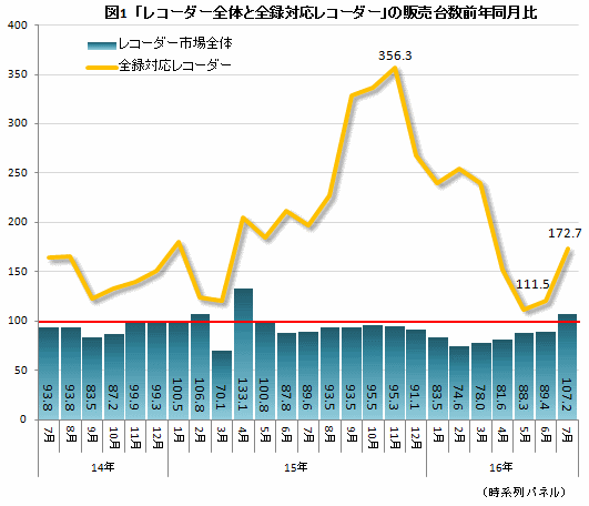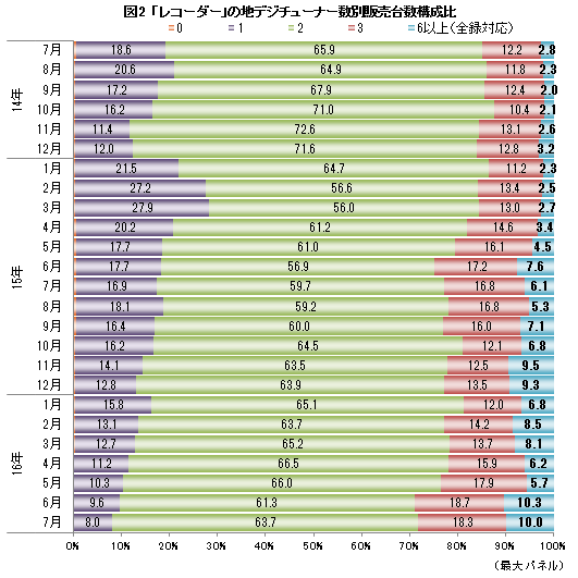 レコーダーで目につくのは、「全録」モデルだ。地デジ放送の主要放送局の番組を全て受信することができる6チューナー以上を搭載したモデルを全録と規定すると、過去2年間、全ての月で前年比を上回り、15年11月には356.3%を記録(図1)。一時は勢いも沈静化しつつあったが、直近の7月では172.7%と常に2ケタ増が続き、持ち直している。また、全体に占める台数比率は6月が10.3%、7月も10.0%と連続して初の2ケタ台となった(図2)。
